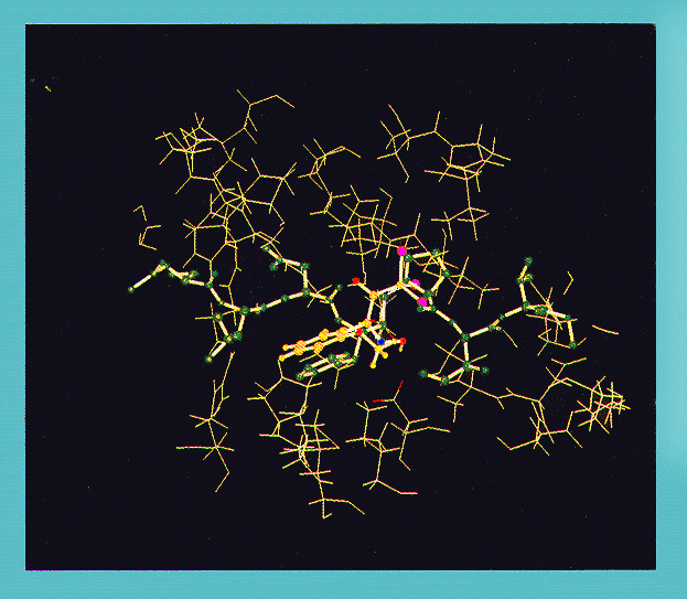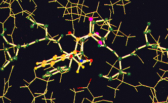 | compound 2:yellow | inhibitor complex JG365:green | oxgen:red | nitrogen:blue |