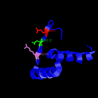 (c) The picture below is the hydrogen bonds between beta-sheet side chains and DNA bases. Show three side chains (gln9, asn11, arg13) from one monomer and corresponding DNA bases of them on your home page. Color three side chain with different color. Measure the distance between possible hydrogen bonds.