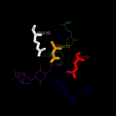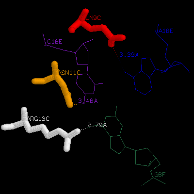 side chains and DNA bases. Show three side chains (gln9, asn11,