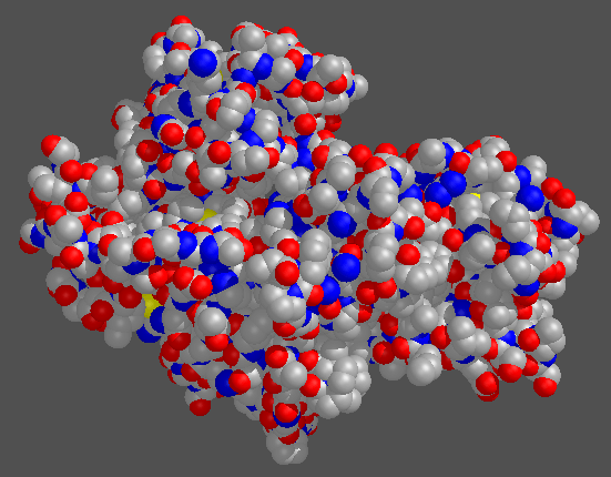This is a molecule of hexokinase, a metabolic protein found in almost all living organisms. This protein is composed of approximately 6000 atoms and weighs 48 kiloDaltons (kDA). It also has a glucose molecule bound to it, but that is nearly impossible to see.