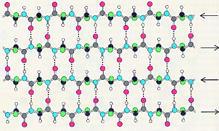 There is a special type of molecular model used to highlight protein secondary structure. Follow this link to view an example. This common type of protein model represents segments of beta-pleated sheets as ribbon arrows, and it represents a-helices as helical ribbons. The remainder of the polypeptide chain is referred to as random coil, and is represented as a thin line. Please note that random coil is somewhat of a misnomer; the protein is definitely highly organized, but the random coil regions do not show any easily categorized secondary structure components.