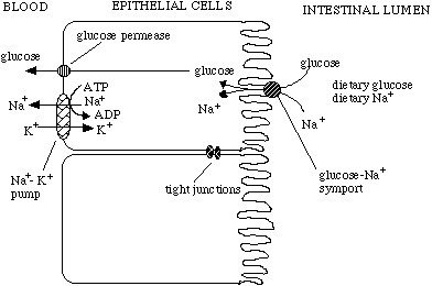 This system is used in a novel way in human gut epithelial cells. These cells take in glucose and Na+ from the intestines and transport them through to the blood stream using the concerted actions of Na+-glucose symports, glucose permeases (a glucose facilitated diffusion protein), and Na+-K+ pumps. Note that the epithelial cells are joined together by tight junctions to prevent anything from leaking through from the intestines to the blood stream without first being filtered by the epithelial cells.