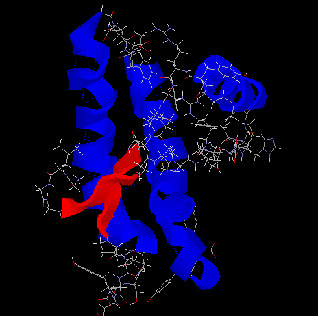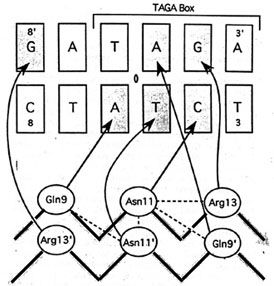 DNA bases. Show three side chains (gln9, asn11, arg13) from one monomer and