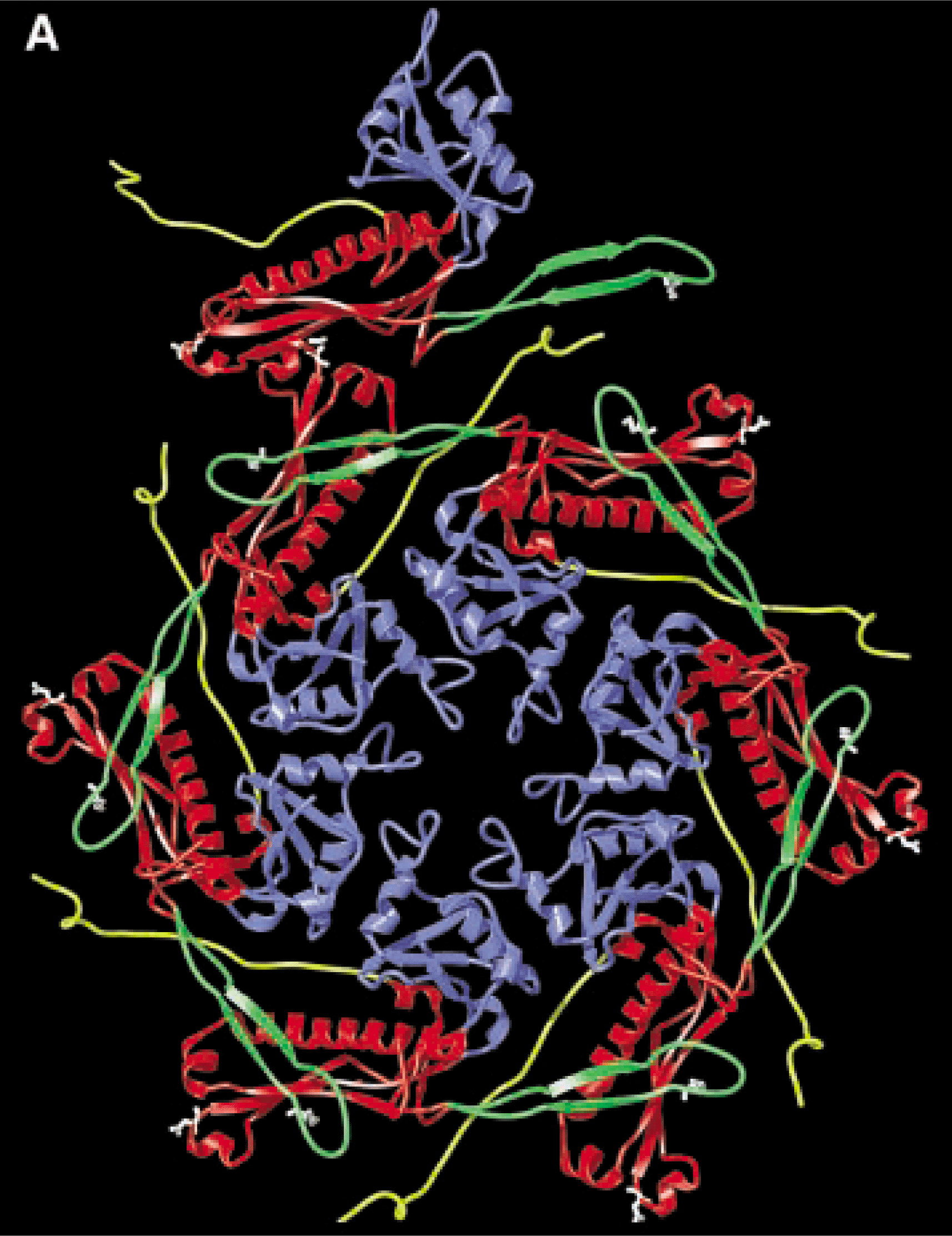 the capsid assymetric unit (A domain:blue ; P domain:red ; N-arm:yellow ; E-loop:green)