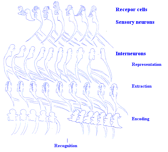 ˙ 建立symbol是神經系統根據神經元的特性所建立的分析方式,作為分析的第一步,中樞神經系統隨演化建立出層級機制,越高等的生物大腦層級越多,並表現在大腦的外觀,功能分區,與智慧能力上