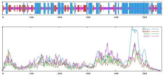 SOPM : Alpha helix (Hh) : 246 is 43.77% 310 helix (Gg) : 0 is 0.00% Pi helix (Ii) : 0 is 0.00% Beta bridge (Bb) : 0 is 0.00% Extended strand (Ee) : 92 is 16.37% Beta turn (Tt) : 40 is 7.12% Bend region (Ss) : 0 is 0.00% Random coil (Cc) : 184 is 32.74% Ambigous states (?) : 0 is 0.00% Other states : 0 is 0.00%