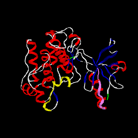 #!rasmol -script # File: IRK1 # Creator: RasMol Version 2.6 zap background [0,0,0] load pdb "1IRK" set ambient 60 set specular off reset slab off rotate z 40 rotate y -45 rotate x 156 set axes off set boundingbox off set unitcell off set hbond sidechain set bondmode and dots off select all colour white wireframe off cartoon 100 select helices cartoon 200 color red select sheets cartoon off strands 200 color blue select *982,1282 color green define pkd (*1155,1156,1157,1158,1159,1160,1161,1162,1163,1164,1165,1166,1167) define npbd(*1029,1030,1031,1032,1033,1034,1035,1036,1037) select pkd cartoon 200 color yellow select npbd color violet |