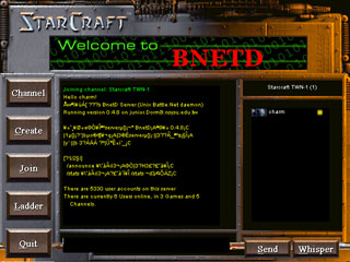 下面的是BattleNet 的聊天室畫面,你可以在這裡物色盟友及敵人。左方第一個按鈕"Channel"讓你切換不同的聊天頻道,你也可以建立自己的聊天頻道(這時你就是頻道主持人了),第二個按鈕"Create" 則是發起一個連線遊戲,你可以隨你的喜好選擇地圖跟遊戲方式,然後等著別人加入你的遊戲。第三個按鈕"Join"則是用來加入已經建立,但人數尚未額滿的遊戲。"Ladder" 則是屬於有特殊規定的挑戰遊戲。