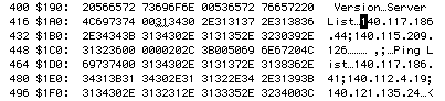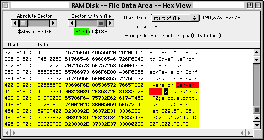 首先你需要一個能修改Data Folk 的軟體,這裡我們用的是Norton Disk Editor,將位於StarCraft Files folder中的Battle.net 檔打開,以Find 指令找尋Server List 這個字串。我們可以發現在第174 個Sector後段有BattleNet Server 的IP 資料。(在修改任何東西前,記得先將Battle.net 這個檔備份下來)