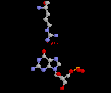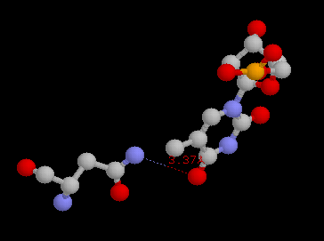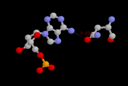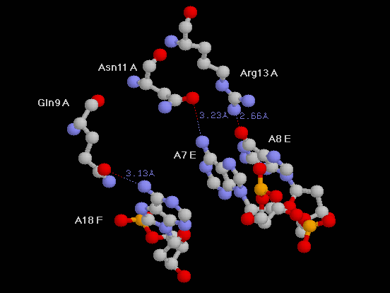 (c) The picture below is the hydrogen bonds between beta-sheet side chains and DNA bases. Show three side chains (gln9, asn11, arg13) from one monomer and corresponding DNA bases of them on your home page. Color three side chain with different color. Measure the distance between possible hydrogen bonds.