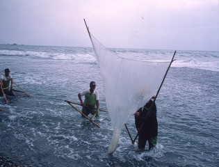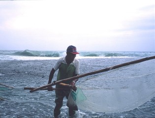 檢視魚貨:在水退去之後,把網稍提高檢視是否有漁獲,若有將網前舉高把網上的漁獲抖入網末端的小網袋中。直到想網袋中的漁獲量達到一定程度時,即可上岸將袋中所有東西到入水桶內。