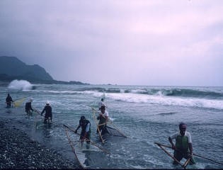 撈捕技術:涉水進入出海口附近海浪衝擊得到的淺水灘,以不超過腰際之深度為安全界線,面對往河口衝來的海浪,待海浪急衝而上力道稍緩之時,以網袋承接被衝上來的水團,濾取順水而來的魚苗。