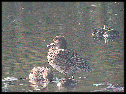 型態特徵:嘴、腳黑色。雄鳥頭至頸部栗褐色;眼周圍暗綠色,延伸至後頭側,外緣有 淡色細邊。背部灰色,有暗色細紋。體側有一白色線斑甚為醒目。胸灰褐色,有暗色細 斑,腹白色,?灰色,有暗色細紋。尾下覆羽黑色,兩側黃色,成三角型斑。飛行時,翼 鏡綠色,上下緣白色,而上緣略寬。雌鳥全身暗褐色,羽緣淡色。過眼線黑色。飛行時 翼鏡上緣白色部分雌鳥較細。雄鳥之非繁殖羽似雌鳥,但翼鏡上緣白色部分較寬。 生態習性:出現於河口、沙洲、湖泊、沼澤及內陸溪地帶。飛行時,振翅速度較其他鴨 種快。