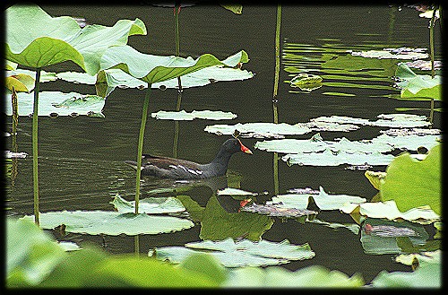 型態特徵:嘴紅色,先端黃色,腳黃綠色,額板紅色腋有白斑,尾下覆羽兩側有橢圓形 白斑。頭至頸部石板黑色,額板紅色。背部黑褐色,胸以下黑色,尾下覆羽兩側有橢圓 形白斑。 生態習性:通常成小群出現於池塘、水田及溪畔等草叢地帶。善泳,浮游於水面時常翹 動尾羽。甚少飛行,欲飛時需要助跑,貼於水面以短距離飛行。